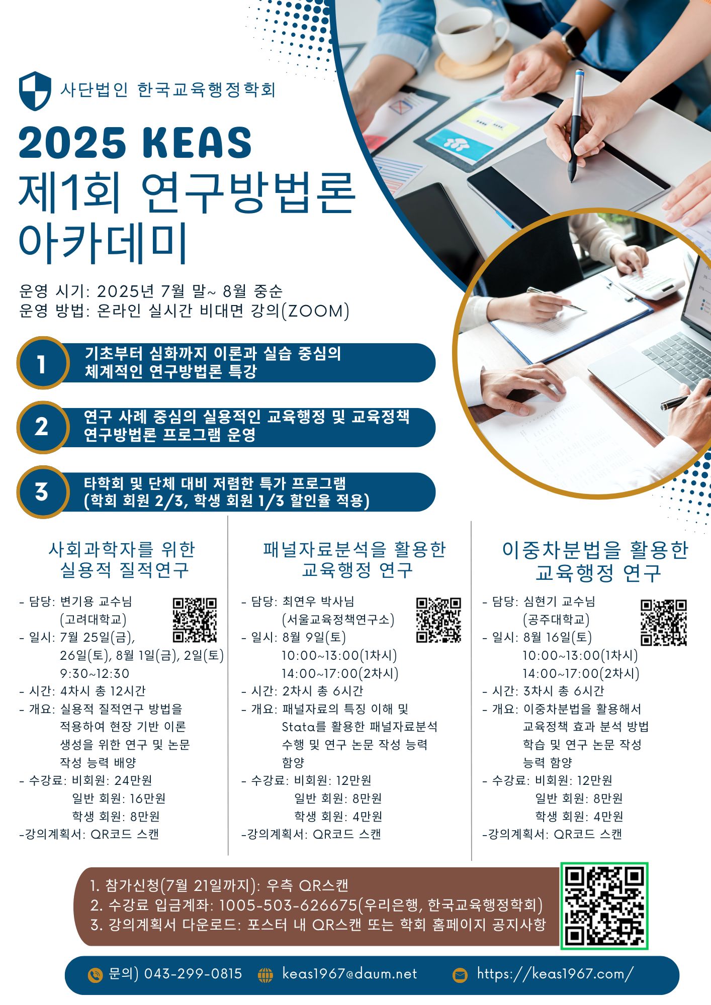 본 학회는 교육행정 연구자와 현장 전문가의 데이터리터러시 및 연구방법론 역량 강화를 지원하기 위해 기초부터 심화까지 들을 수 있는 연구방법론 특강인 「2025 KEAS 제 1회 연구방법론 아카데미」프로그램을 기획하였습니다. 타 학회 및 단체에 대비하여 저렴한 특가로 프로그램을 기획하였으니, 참여를 희망하시는 회원님들께서는 아래 설문을 작성해주시면 감사하겠습니다.