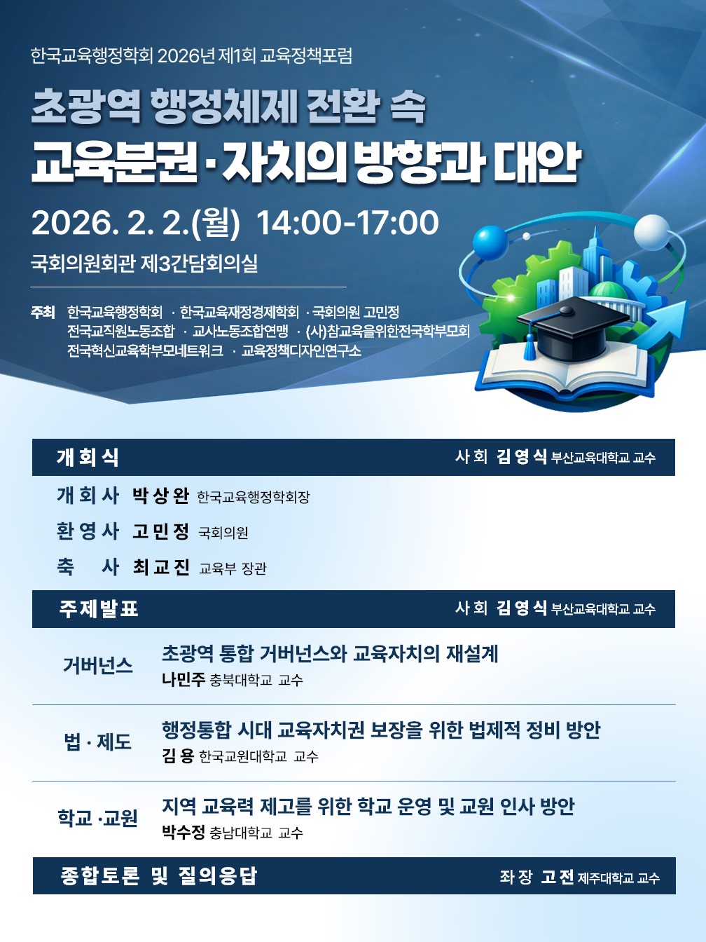 2026년 2월 2일(월), '초광역 행정체제 전환 속 교육분권 및 자치의 방향과 대안'을 주제로 행정통합 포럼이 진행되었습니다.