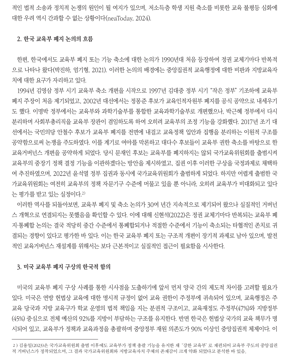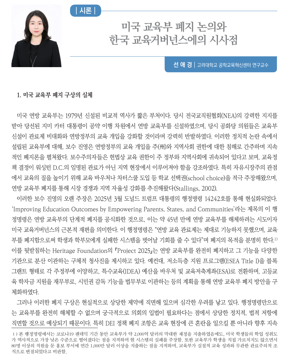 미국 교육부 폐지 논의와 한국 교육거버넌스에의 시사점(선애경, 고려대학교 공학교육혁신센터 연구교수)
