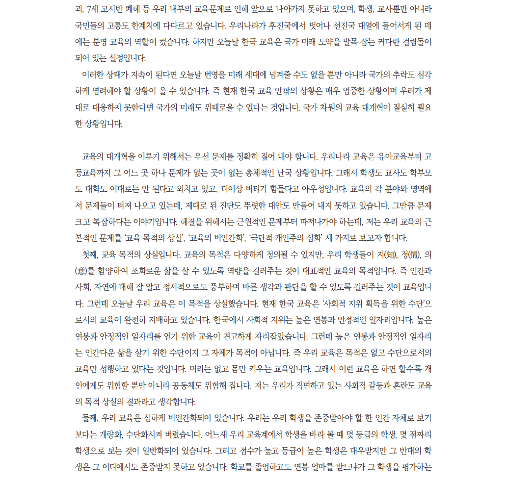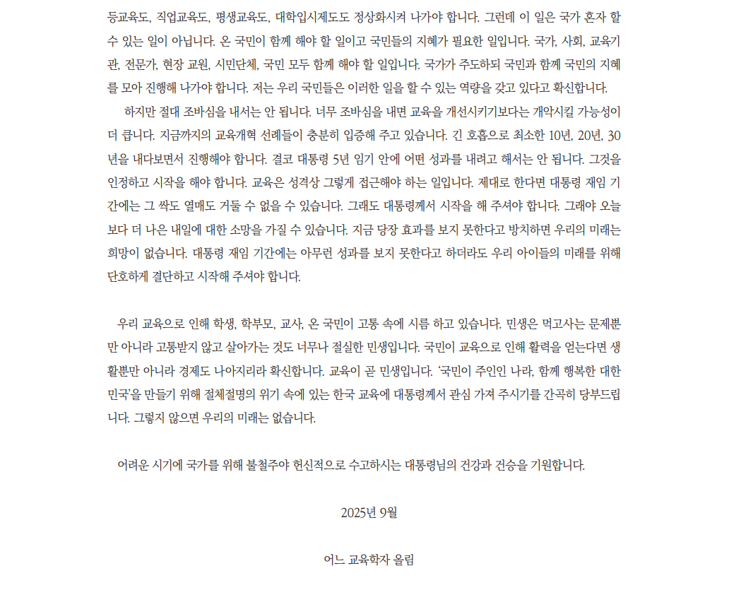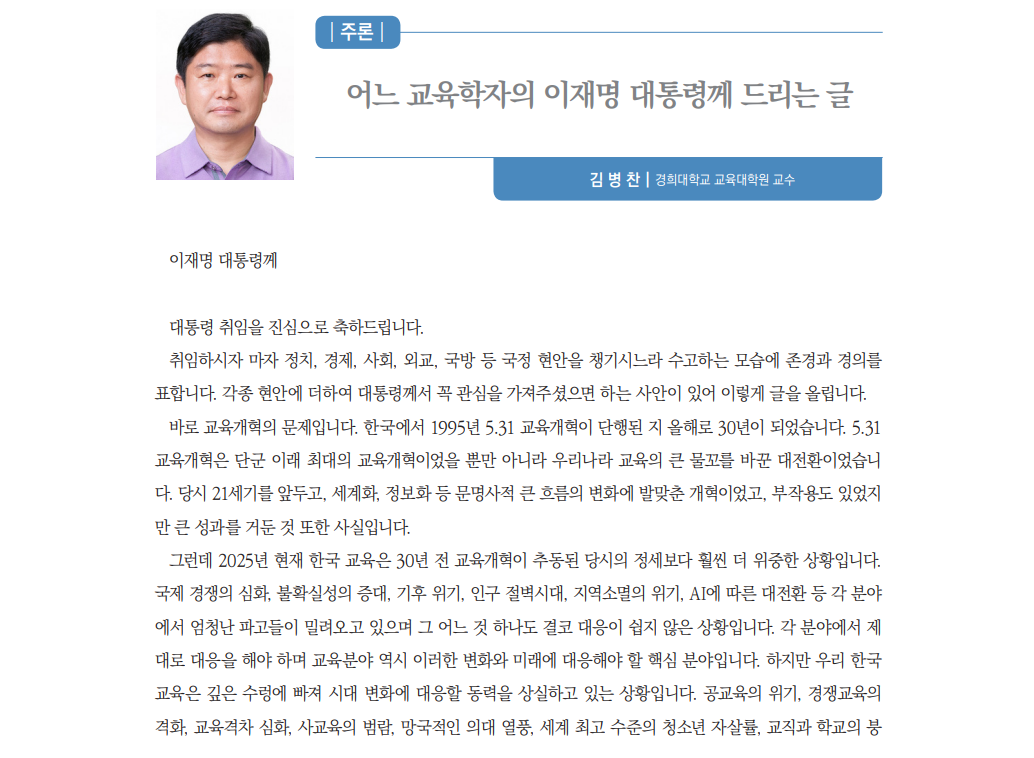 어느 교육학자의 이재명 대통령께 드리는 글(김병찬, 경희대학교 교육대학원 교수)