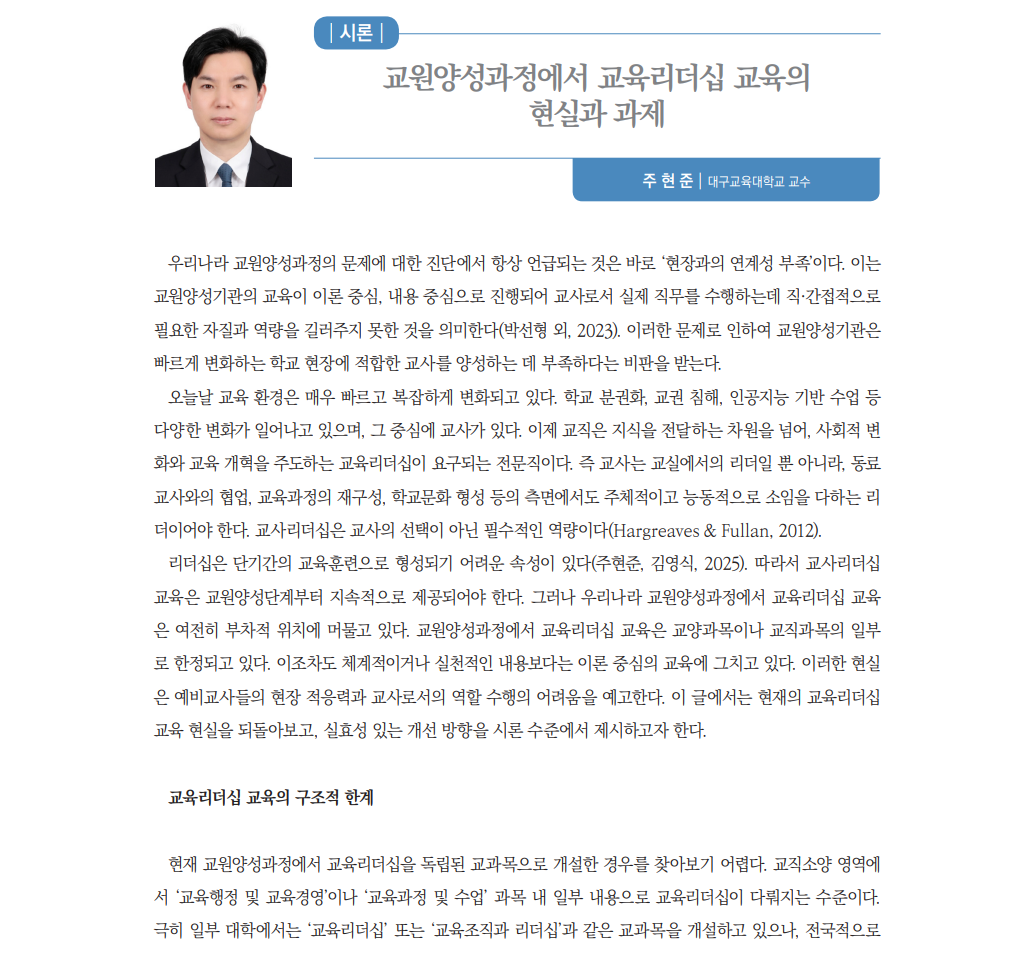 교원양성과정에서 교육리더십 교육의 현실과 과제(주현준, 대구교육대학교 교수)