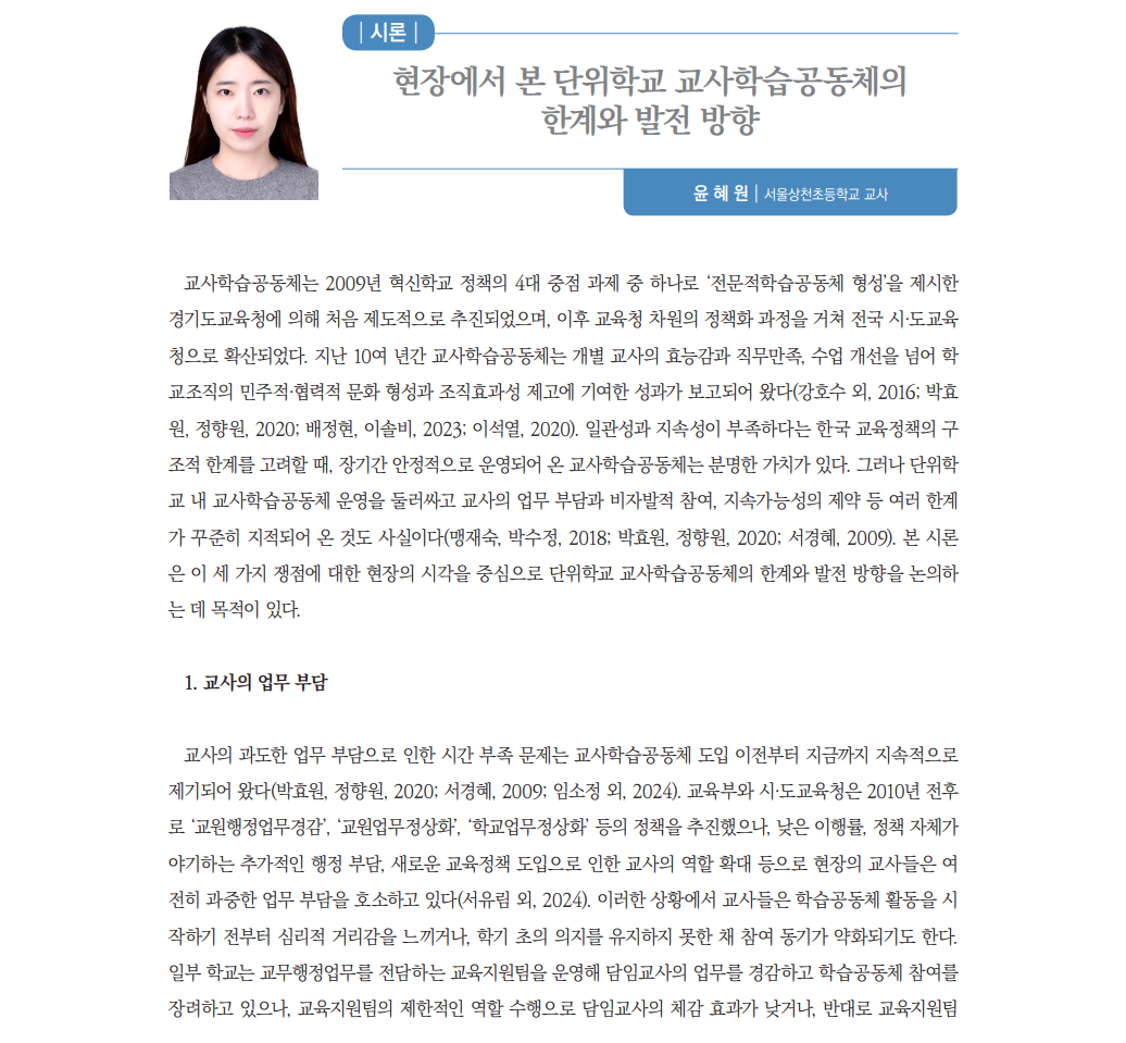 현장에서 본 단위학교 교사학습공동체의 한계와 발전 방향(윤혜원, 서울상천초등학교 교사)