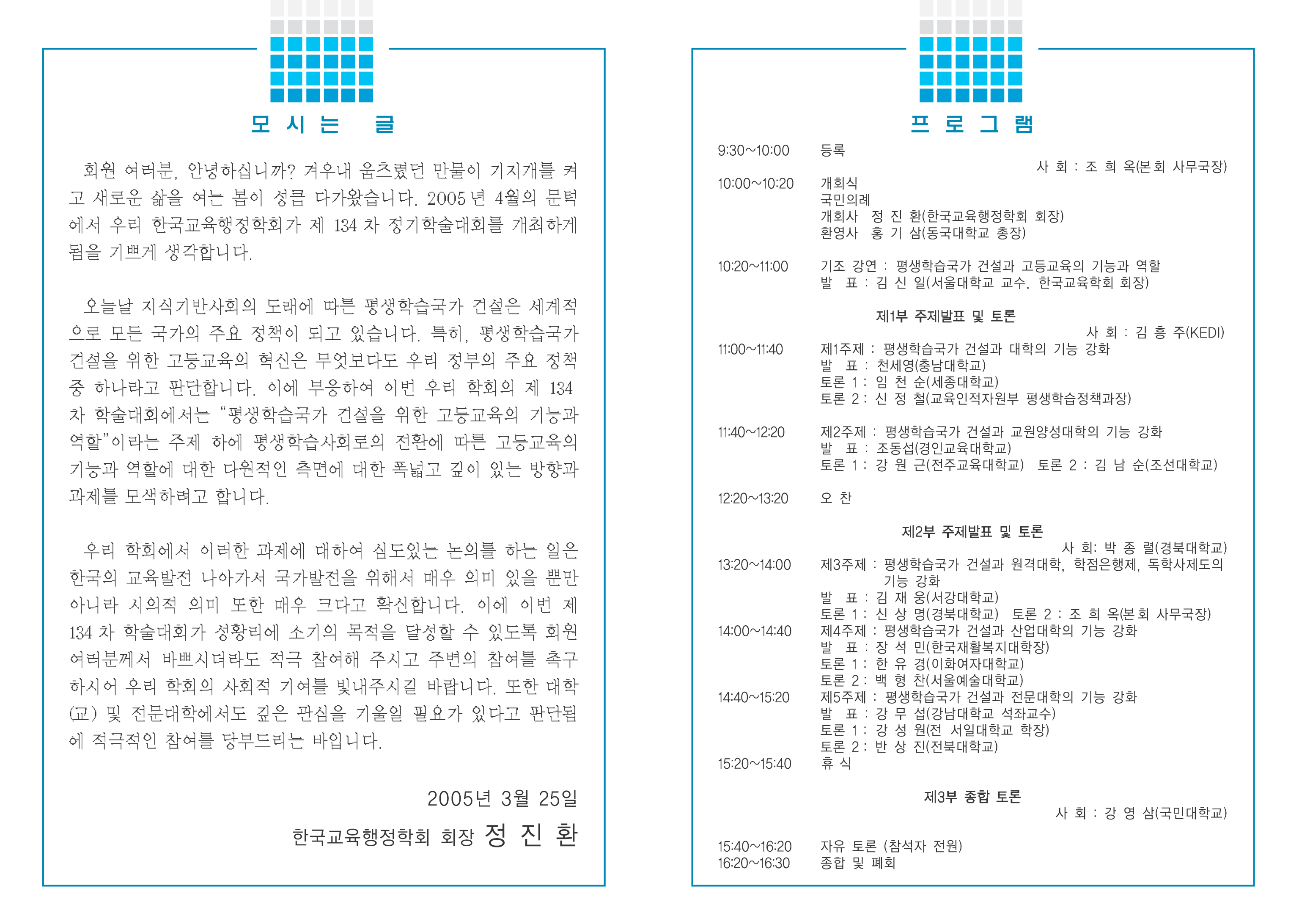 안녕하세요. 134차 학술대회가 다음과 같이 열림니다. 일 시 : 2005년 4월 8일 (금) 오전 10시 장 소 : 동국대학교 90주년 기념 문화관 자세한 문의는 첨부파일을 참고하시기 바랍니다.